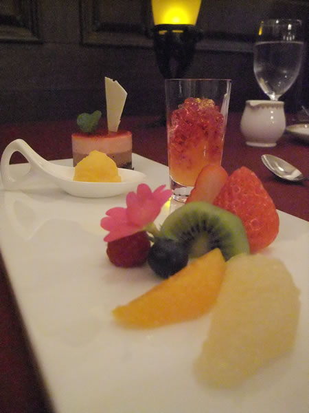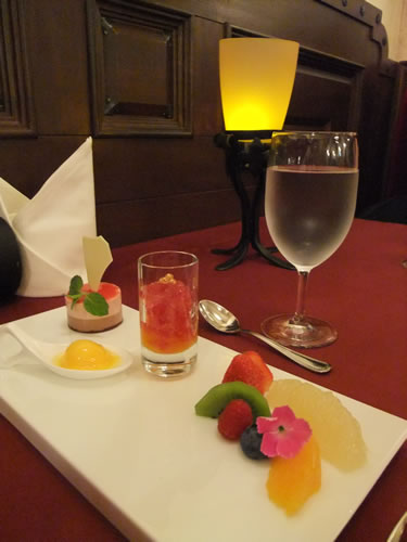 奥から、フランボワーズとチョコのムース、マンゴーのソルベ、